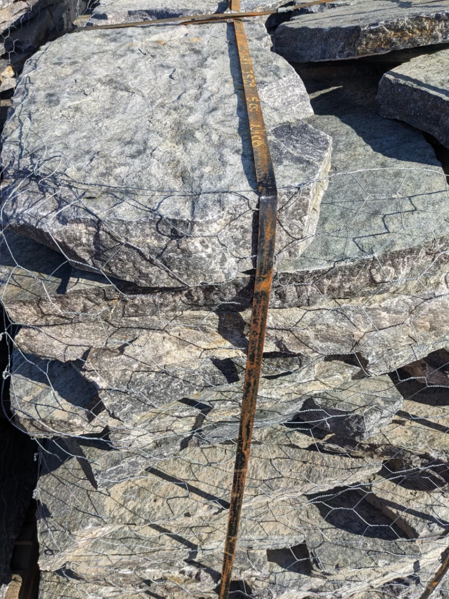 This gorgeous quartzite is mainly grey and tan with mica, showing silver streaks and highlights. An excellent product for unique patios and rock accents showing a bit of sparkle in the sun.